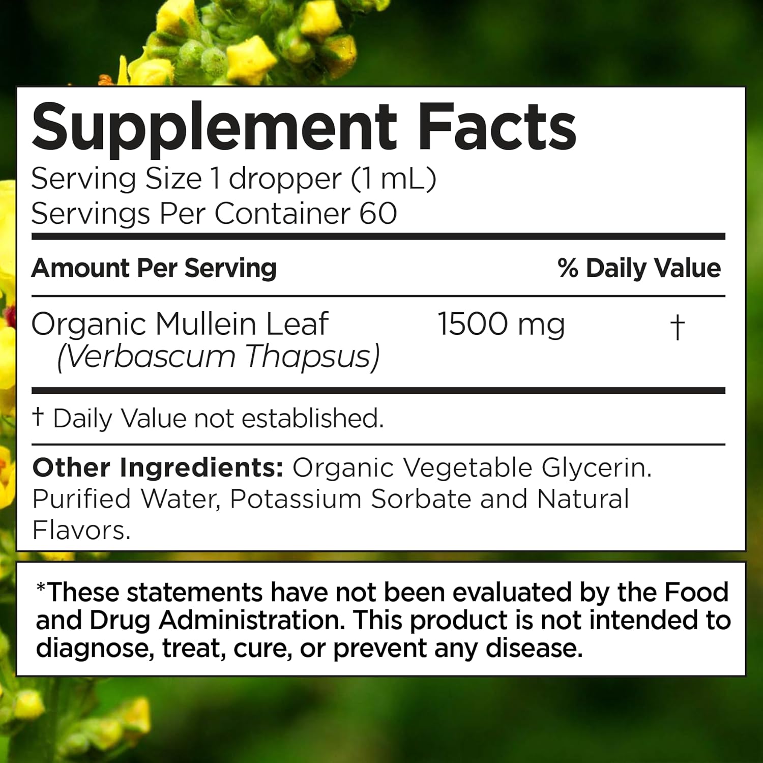 𝐓𝐚𝐬𝐭𝐲, 𝐍𝐚𝐭𝐮𝐫𝐚𝐥, 𝐚𝐧𝐝 𝐏𝐮𝐫𝐞: Packaged in a 2 fl. oz amber glass bottle to maintain purity, each 1ml serving contains 1500mg of organic mullein leaf extract with no GMOs or artificial ingredients. A delicious, natural choice for anyone seeking to incorporate mullein into their routine.