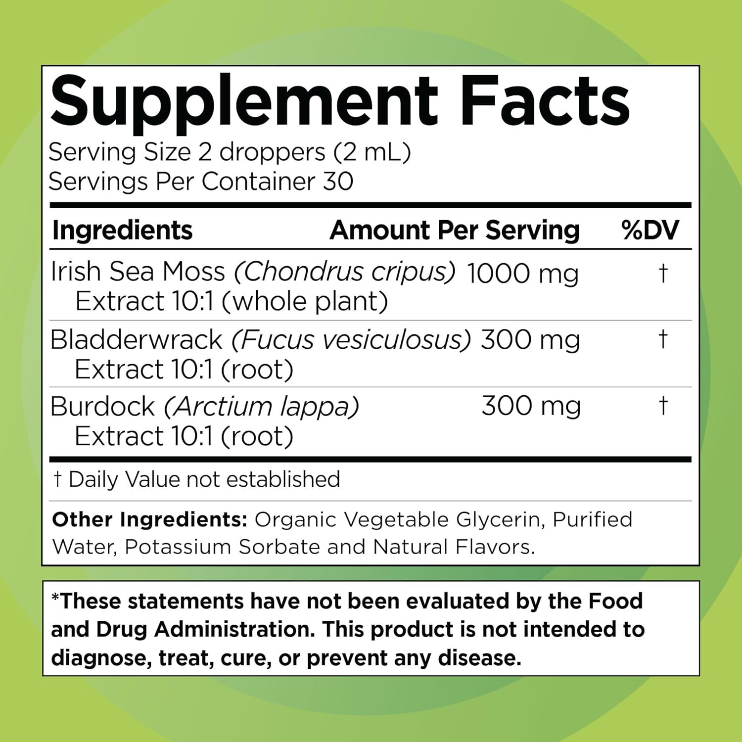 Daily Dose of Goodness: Take two full droppers once a day with water, preferably after a meal or as directed by your healthcare professional. Each serving contains 1000mg of sea moss liquid drops extract and 300mg of bladderwrack and burdock root, designed for enhanced absorption. Vegan-friendly, non-GMO, and suitable for paleo, keto, and vegetarian diets.